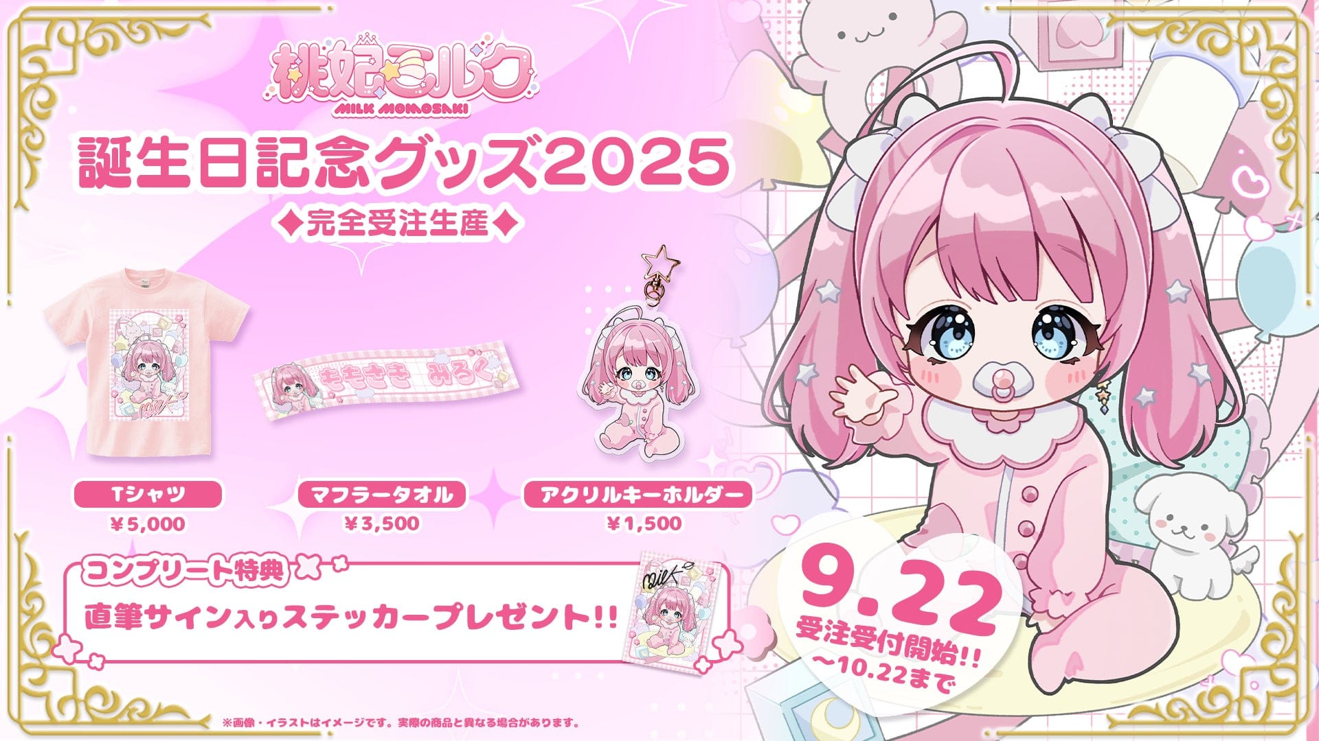 こちらは「桃妃ミルク」2025年度の誕生日を記念したグッズのページとなっております。 完全受注生産になっておりますので、予めご了承ください。 〈販売期間〉   2025年9月22日19時~2025年10月22日23時59分まで 〈発送時期〉...