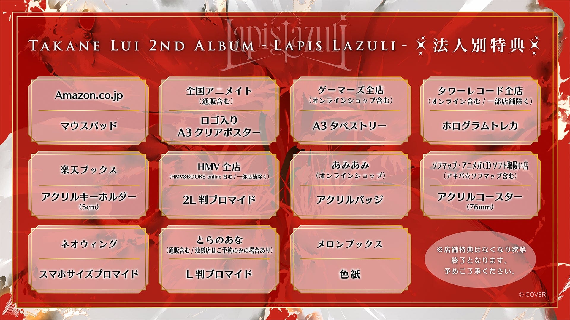 下記販売店にて『Lapis Lazuli』通常盤(初回生産分)をお買い上げのお客様に先着で店舗別購入特典 を差し上げます。