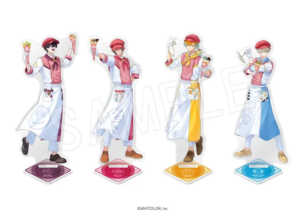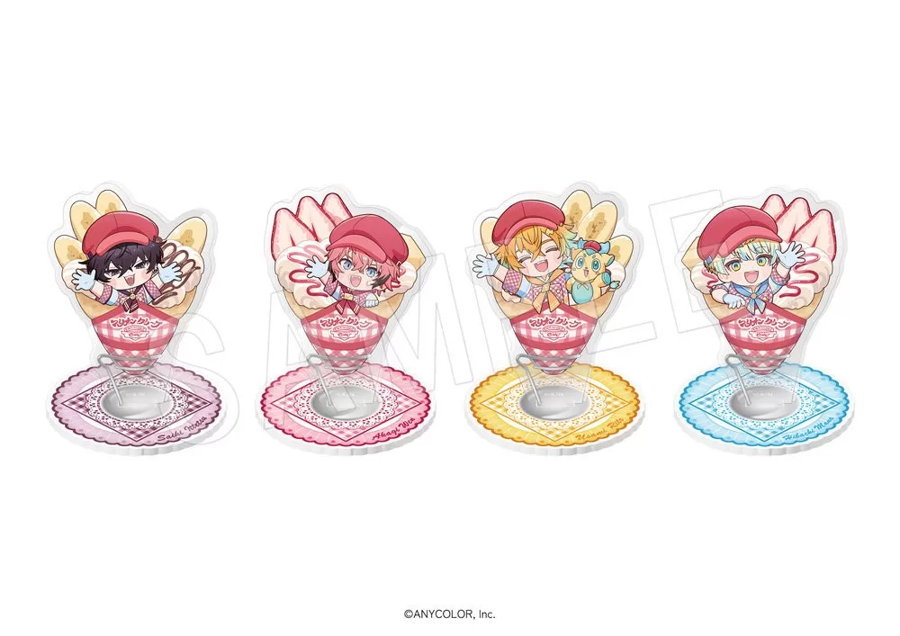 コラボでは、お揃いの制服姿でクレープを提供する様子を描いた新規ビジュアルを使用したグッズを展開。等身アクリルスタンド(各1,650円)、トレーディングアクリルスタンド(660円)、トレーディンググリッター缶バッジ(550円)、クレープ型アクリルキーホルダー(880円)、フレークシールセット(880円)、クレープのような形状になるハンカチ(1,320円)などが販売される。