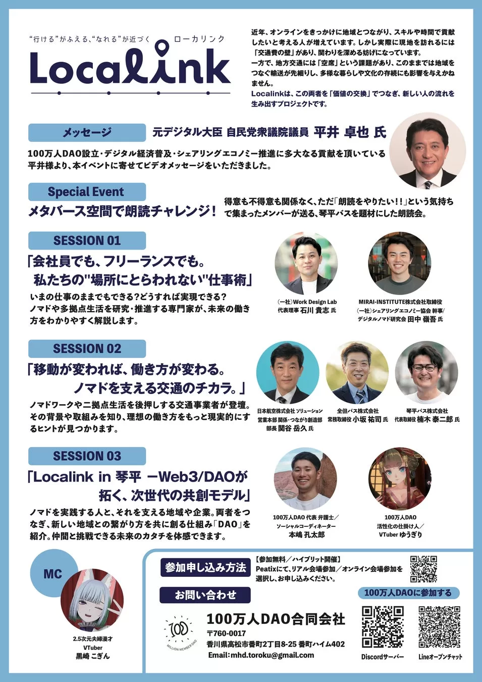 100万人DAO合同会社は、2025年10月4日(土)に香川県琴平町の「コトリ コワーキング&ホステル琴平」およびオンライン(メタバース・YouTube)にて、地方創生と新しい働き方をテーマとしたイベント『Localink(ローカリンク)』を開催すると発表した。