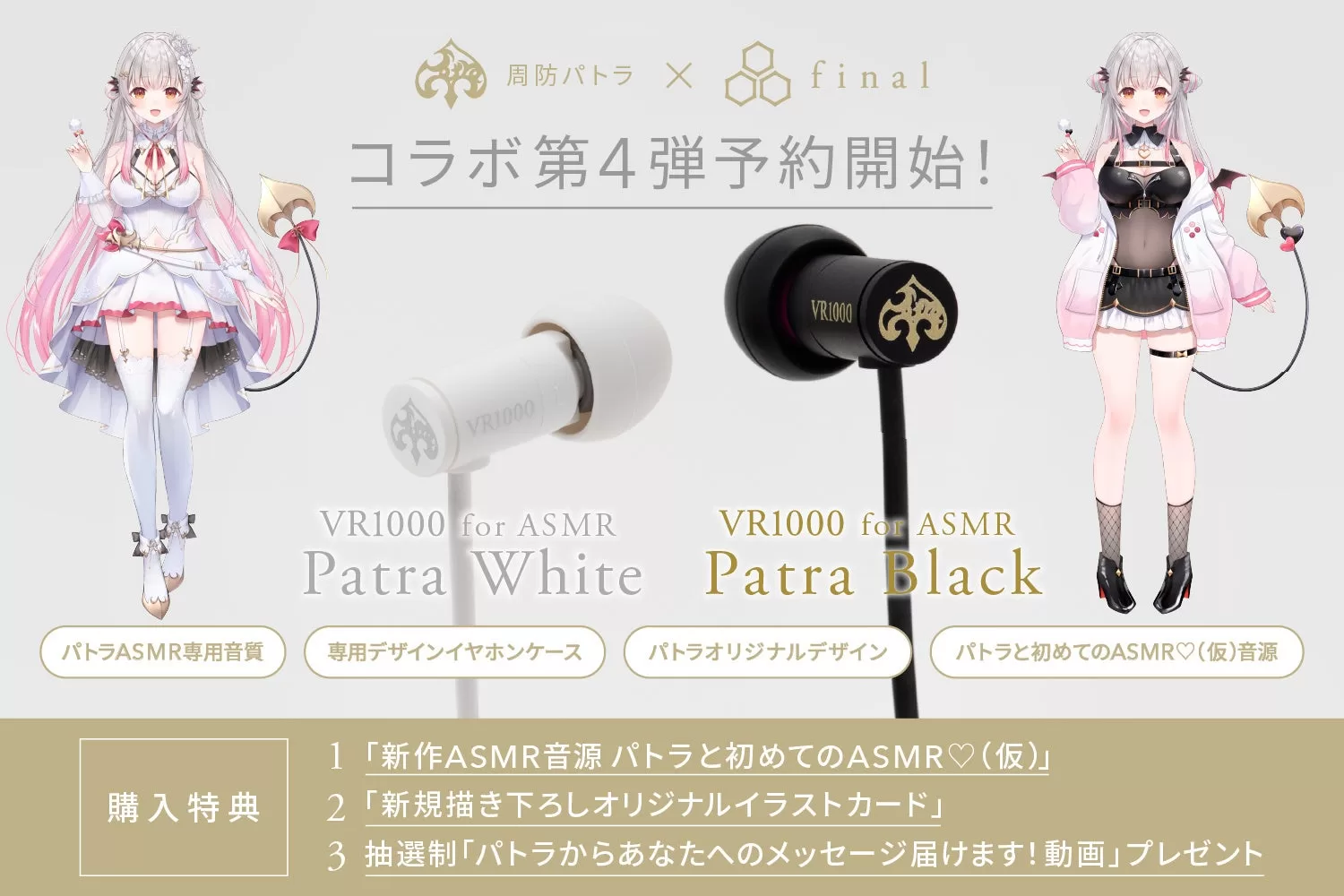 株式会社finalは10月3日、VTuber周防パトラとのコラボレーション企画第4弾となる有線イヤホン「VR1000 for ASMR Patra White/Patra Black」の予約受付を公式オンラインストアで開始した。