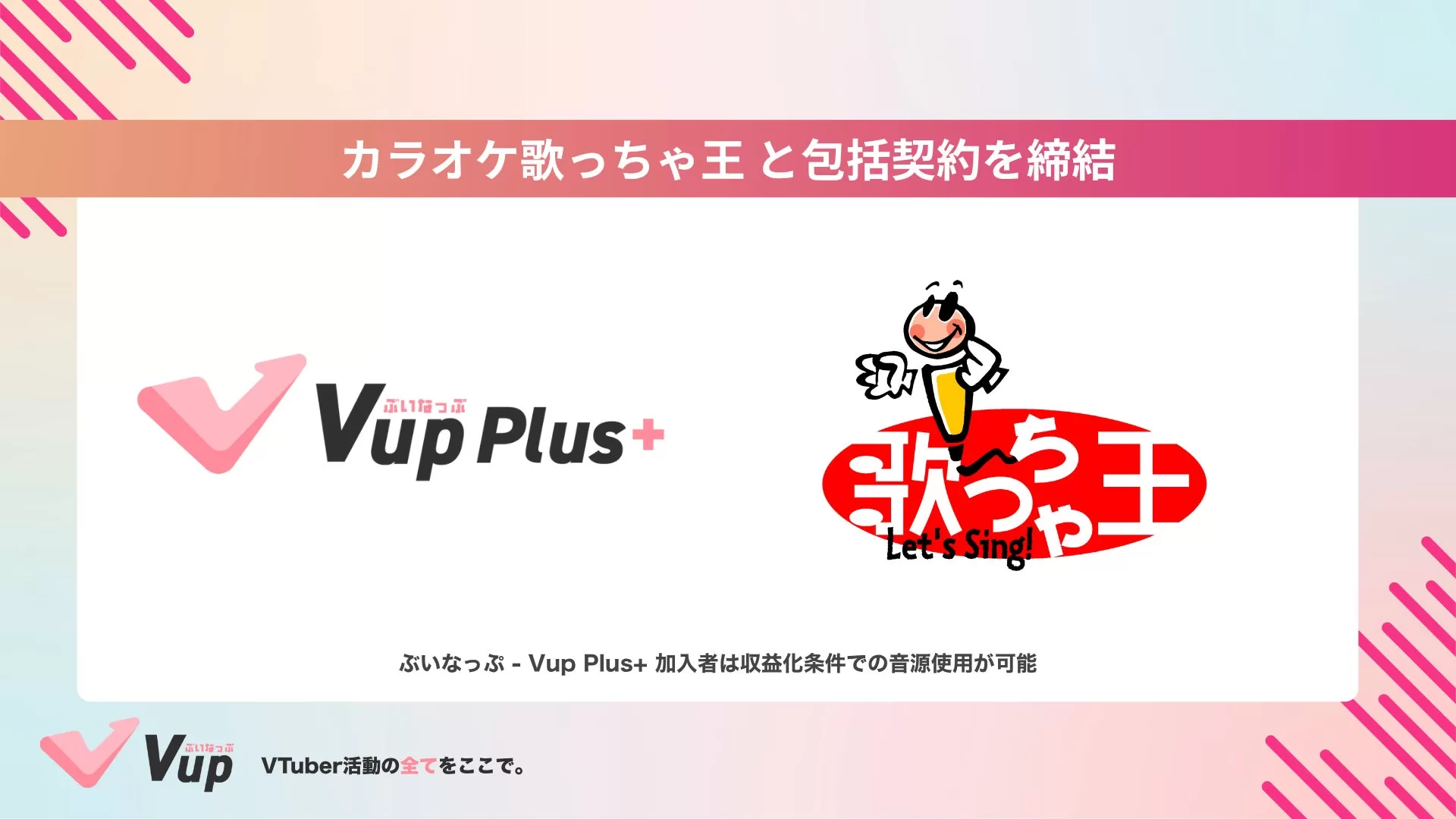 同社は株式会社友ミュージックと包括契約を締結しており、Plus+会員は「カラオケ歌っちゃ王」が提供する高品質なカラオケ音源をVTuber活動に使用できる。これにより、歌配信や歌ってみた動画などの音楽コンテンツを収益化しながら配信・投稿することが可能となる。