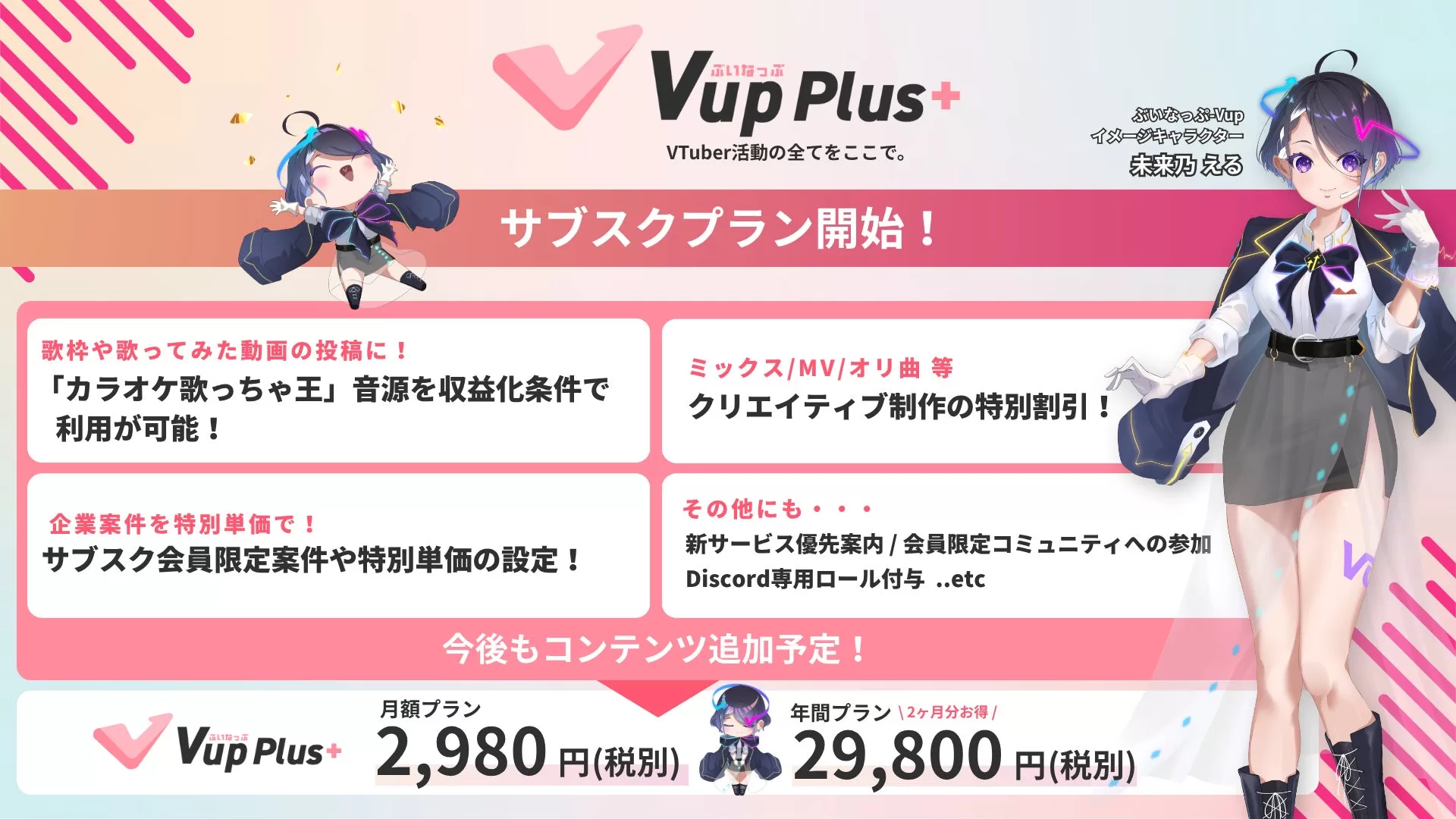 ぶいなっぷ – Vup Plus+は、月額2,980円(税別)で、YouTubeチャンネル「カラオケ歌っちゃ王」の音源利用権やクリエイティブ割引クーポンなど、VTuber活動に役立つ特典を提供する。年間プランも29,800円(税別)で用意されており、2ヶ月分お得となる。