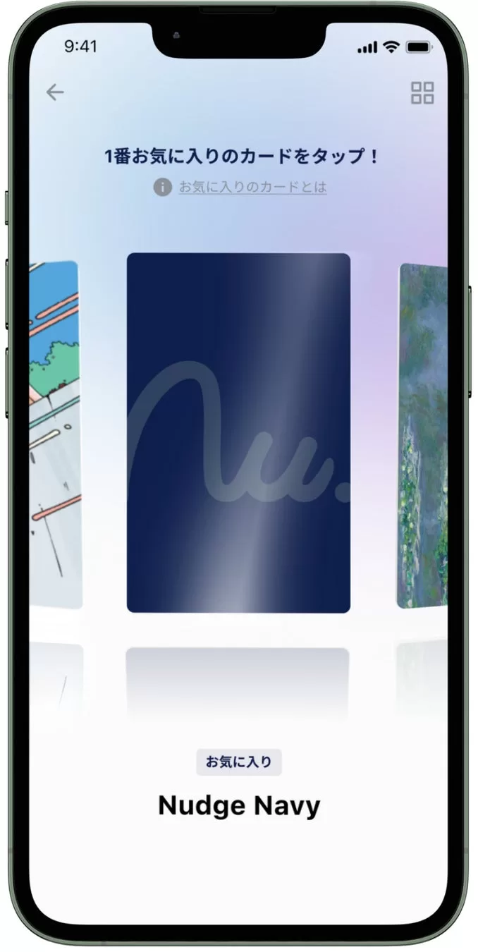 ナッジカードでは1つのカード番号でデザインの異なるカードを複数枚発行可能で、300種類以上のデザインから選択できる。アプリ上で「お気に入りのカード」を設定すれば、バーチャルカードデザインを自由に切り替えることも可能となっている。