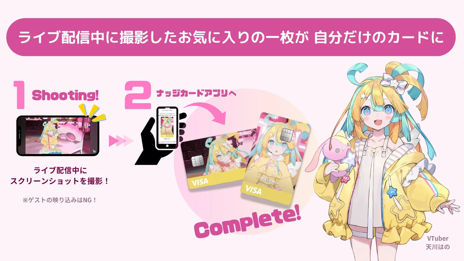 VTuber・天川はのさんとは、世界初(※)となるYouTubeライブ連動型のカード発行イベントを開催しました。生配信中にユーザーが撮影したスクリーンショットをそのままカードデザインにできるという試みで、大いに盛り上がりました。