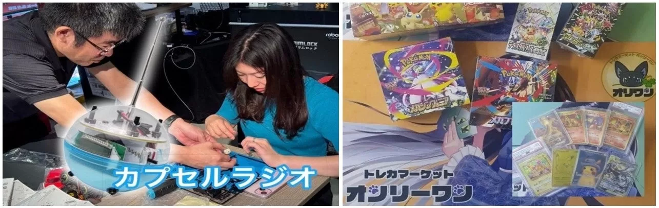 ③サブカルスペースでは、カプセル型FMラジオ工作キットを使って、初めての方でも短時間で手軽に電子工作を体験できます。また、日本を代表するトレーディングカードゲームのシングルカード及び未開封BOXの販売を行い、ランダム当たりくじなどもお楽しみいただけます。
