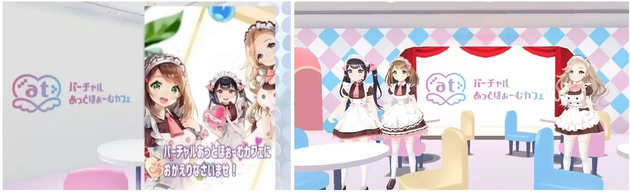 バーチャル世界にあるメイドカフェで『実際にお給仕するメイド』たちと、話して遊んで過ごせるコミュニケーションアプリ「バーチャルあっとほぉーむカフェ」の体験と、会場の秋葉原UDX1Fのサボニウス広場を再現した「バーチャルにぎわい広場」内に特別に用意された、複数のメイドと同時に会話できるVRChat版の「バーチャルあっとほぉーむカフェ」の体験もお楽しみいただけます。