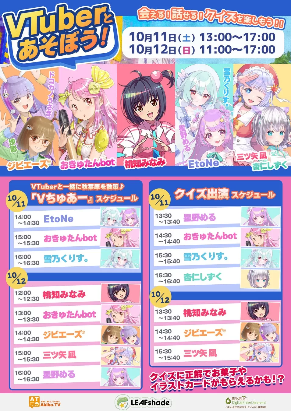 VTuberとトークできる無料交流体験、VTuebrの最新情報を掲載した自社広報誌『LEAFマガジン』の配布、VTuberカードゲーム『VoV(Virtual of Versus)』の体験・販売コーナーなどが楽しめる内容となっています。