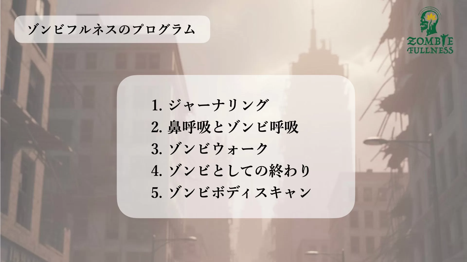 このプログラムは、現代社会が抱える「思考過多」や「自己意識の過剰」からの解放を目的としており、ゾンビの脱力や無意識性を取り入れた新しいマインドフルネス体験を提供する。30分から60分のプログラムで、ジャーナリングやゾンビウォークなど5つのプログラムから構成されている。