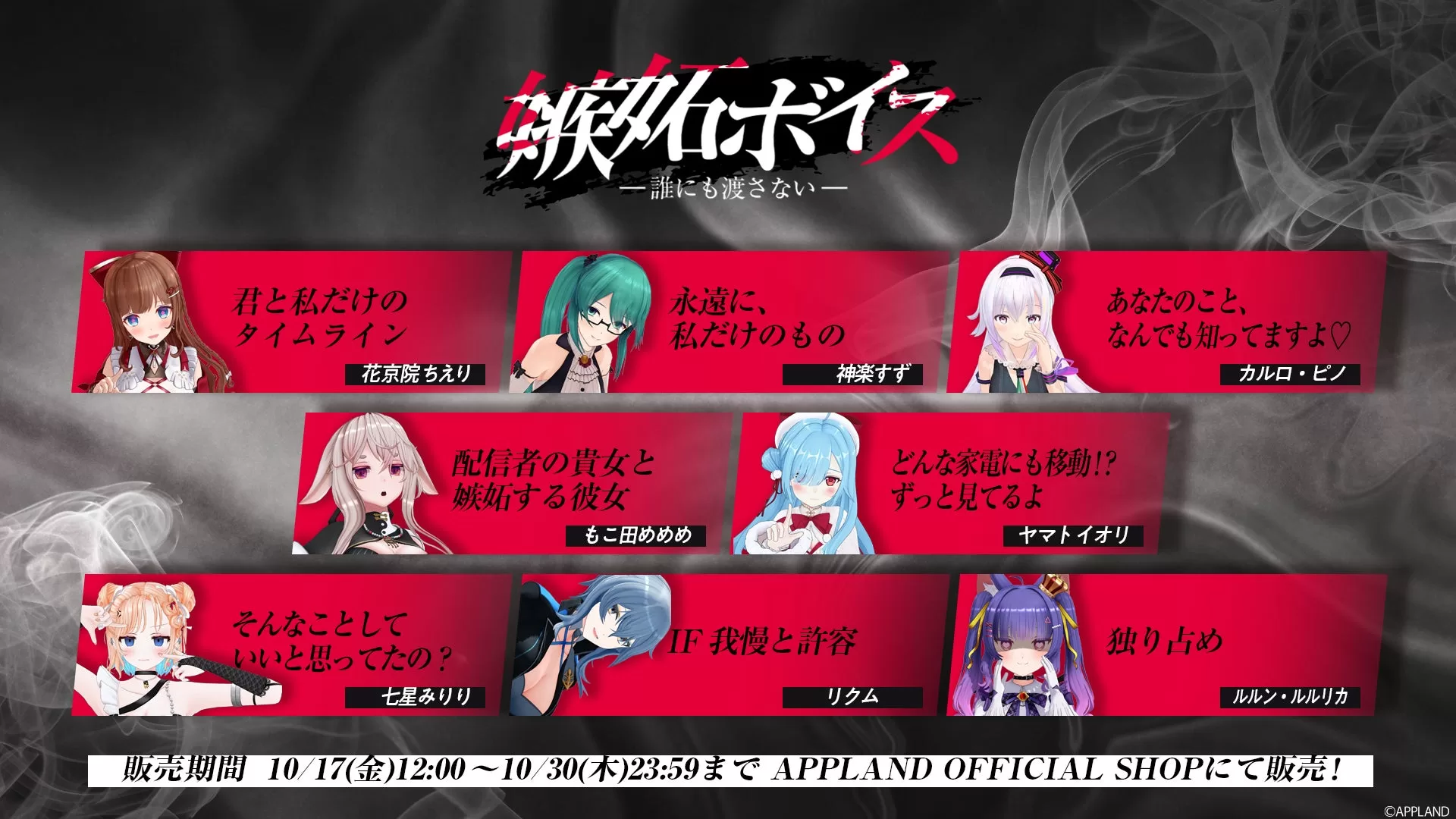 本商品は『嫉妬と独占欲が絡み合う、危うい恋の物語』をテーマに、.LIVEメンバーとぶいぱいメンバーそれぞれが考案した嫉妬に関するシチュエーションを楽しめるボイスコンテンツとなっている。価格は各2,500円(税込)で、フルコンプリートセットは50,000円(税込)、各グループ別のコンプリートセットも用意されている。