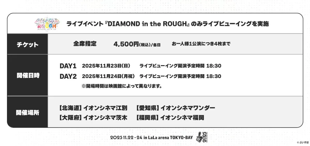 また、11月23日・24日に開催されるライブイベント「DIAMOND in the ROUGH」のライブビューイングを全国4都市(北海道・愛知県・大阪府・福岡県)で実施することも明らかにした。ライブビューイングの料金は全席指定4,500円で、10月18日よりオフィシャル先行受付(抽選)が開始される。