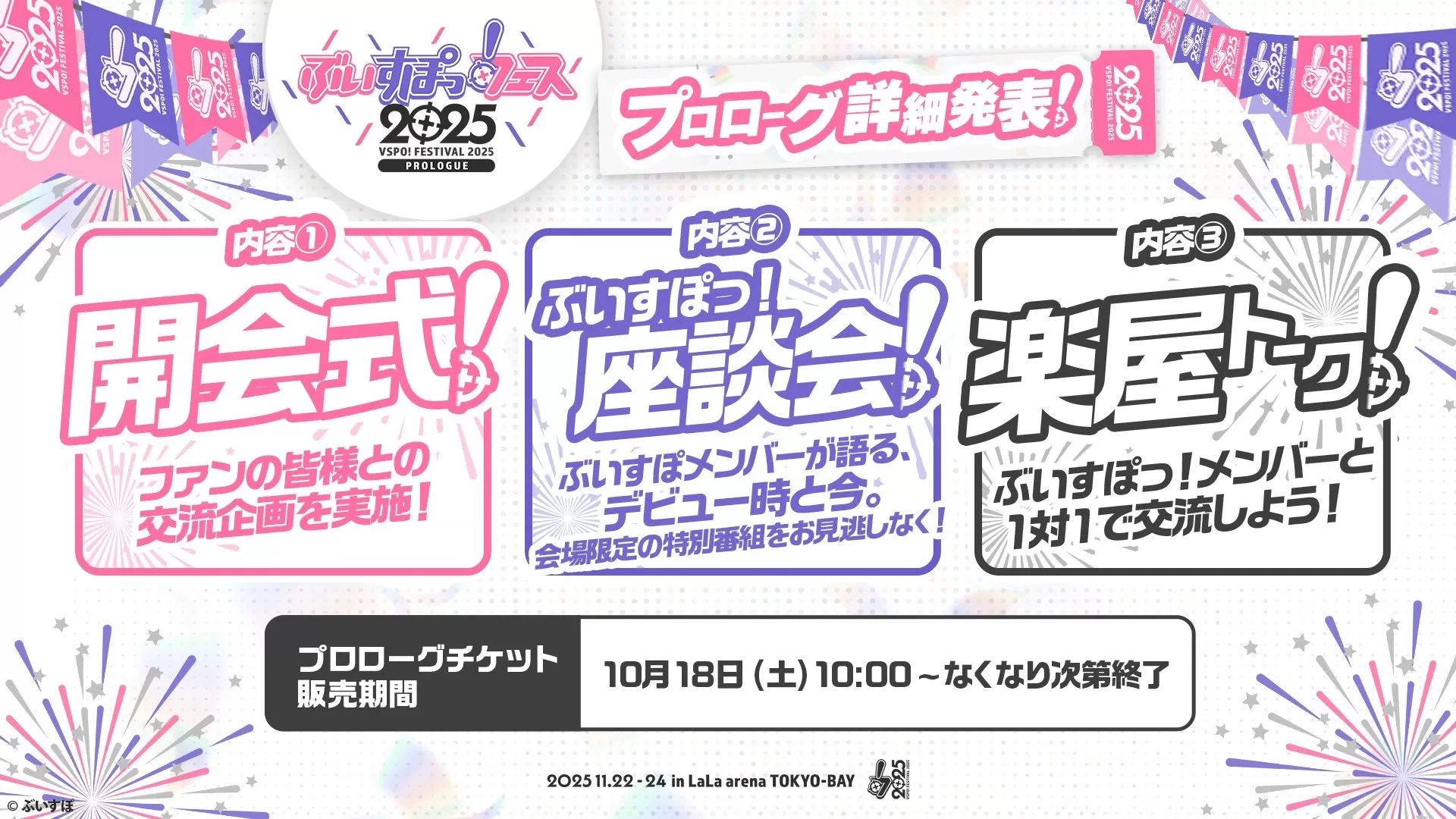 次世代Virtual esports Project「ぶいすぽっ!」は、2025年11月22日から24日までの3日間、LaLa arena TOKYO-BAYで開催する『ぶいすぽっ!フェス 2025』の現地チケットを10月18日AM10時より先着順で一般発売すると発表した。