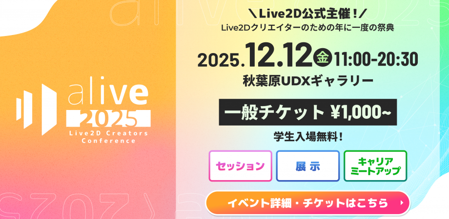 株式会社Live2Dは、2025年12月12日に開催する同社主催イベント「alive 2025」の協賛企業情報を公開した。本イベントは秋葉原UDXギャラリーで開催され、2D表現に関わるクリエイターや企業、教育機関が集まる年次祭典となる。