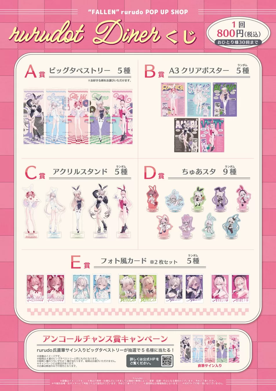 rurudo氏考案のオリジナルキャラクター「ラビ」「シュガー」「ブラン」「アメリ」「ビビット」で構成されたバニーガールレストラン「rurudot Diner」のイラストを使用した『rurudot Dinerくじ』を販売します。各賞の他、くじを購入いただき応募条件を満たした方はrurudo氏サイン入りビッグタペストリーが当たるアンコールチャンス賞に参加することができます。