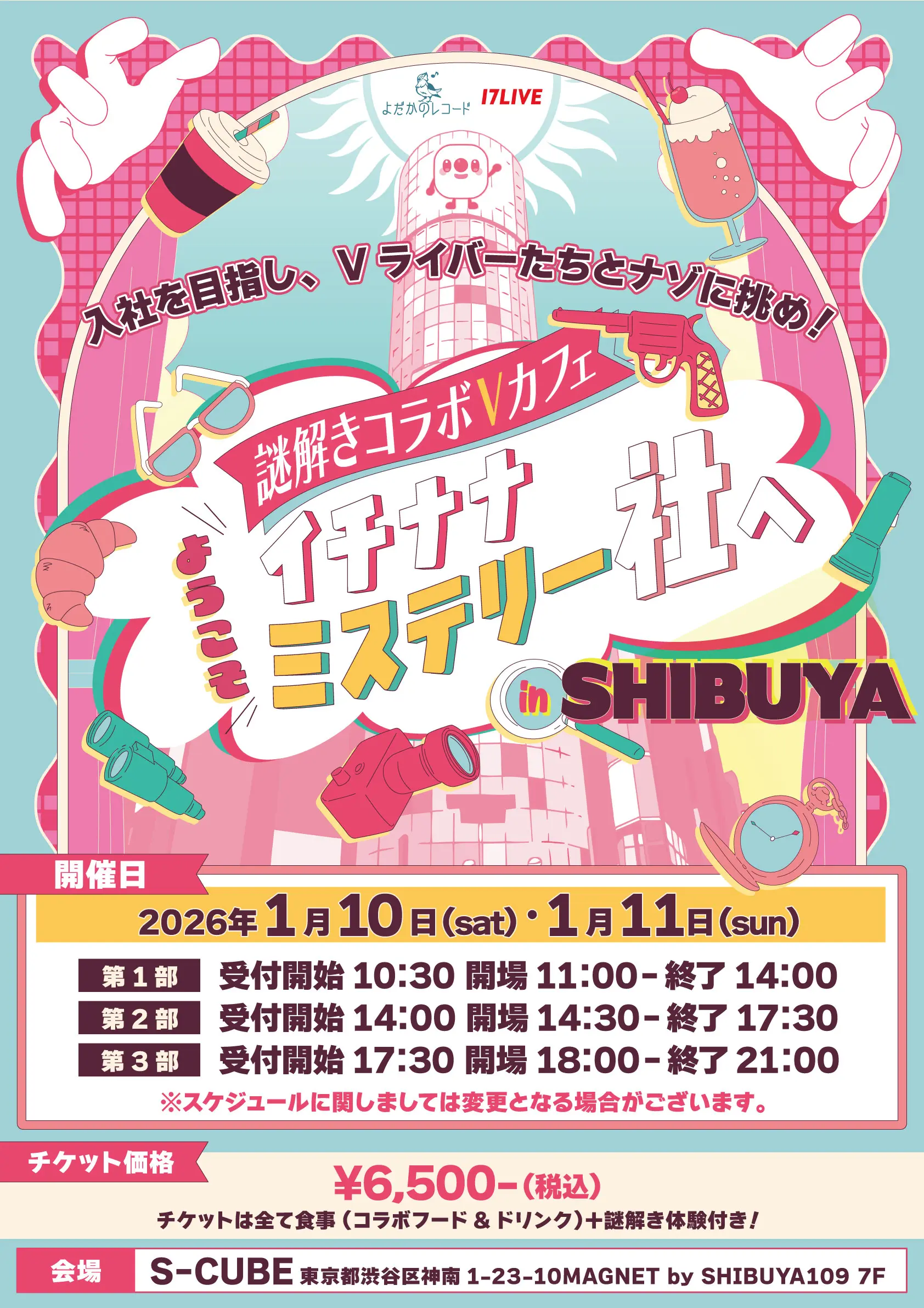 17LIVE株式会社(東京都渋谷区、代表取締役:ジャン・ホンフイ、URL:https://jp.17.live/)が運営する日本最大級のライブ配信アプリ「17LIVE(イチナナ)」は、「17LIVE」で活躍する人気Vライバー18名が参加する謎解きコラボカフェ企画「ようこそ、イチナナミステリー社へin SHIBUYA」を、2026年1月10日(土)から1月11日(日)にかけて、「MAGNET by SHIBUYA109」内のカフェスペース「S-CUBE」にて開催することが決定しましたので、お知らせいたします。