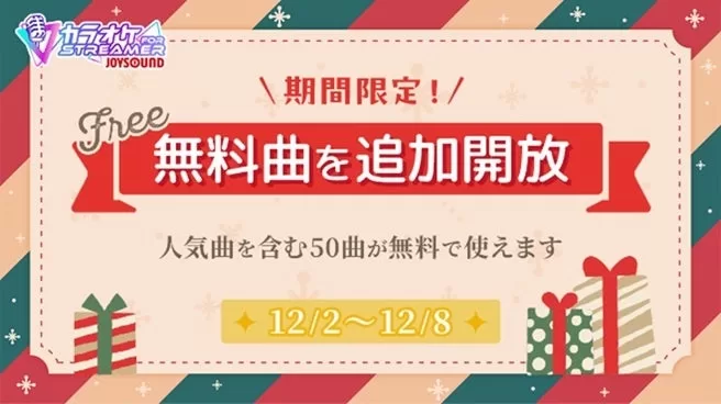 出演者は、企業VTuberプロジェクトをはじめ、KADOKAWA CSP、Game8からの出演に加え、日頃サービスをご利用いただいているユーザーの皆様の出演枠もご用意しました。なお、本イベント開催に伴い、12月2日(火)~12月8日(月)の期間中は、従来のお試し曲に加えて、カラオケ人気曲20曲を始めとした全50曲を無料で追加開放!普段から本サービスをご愛用いただいている皆さまはもちろん、カラオケを活用した配信に挑戦してみたいという方でも、気軽にご応募いただけます。まだサービスをご利用されていない方も、この機会にぜひ、無料でカラオケ配信をお楽しみください。