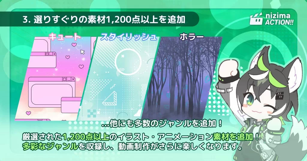 さらに「キュート」「スタイリッシュ」「和風」「ホラー」といったジャンルが素材集に登場。素材のバリエーションと使いやすさが向上し、動画制作がさらに捗ります。