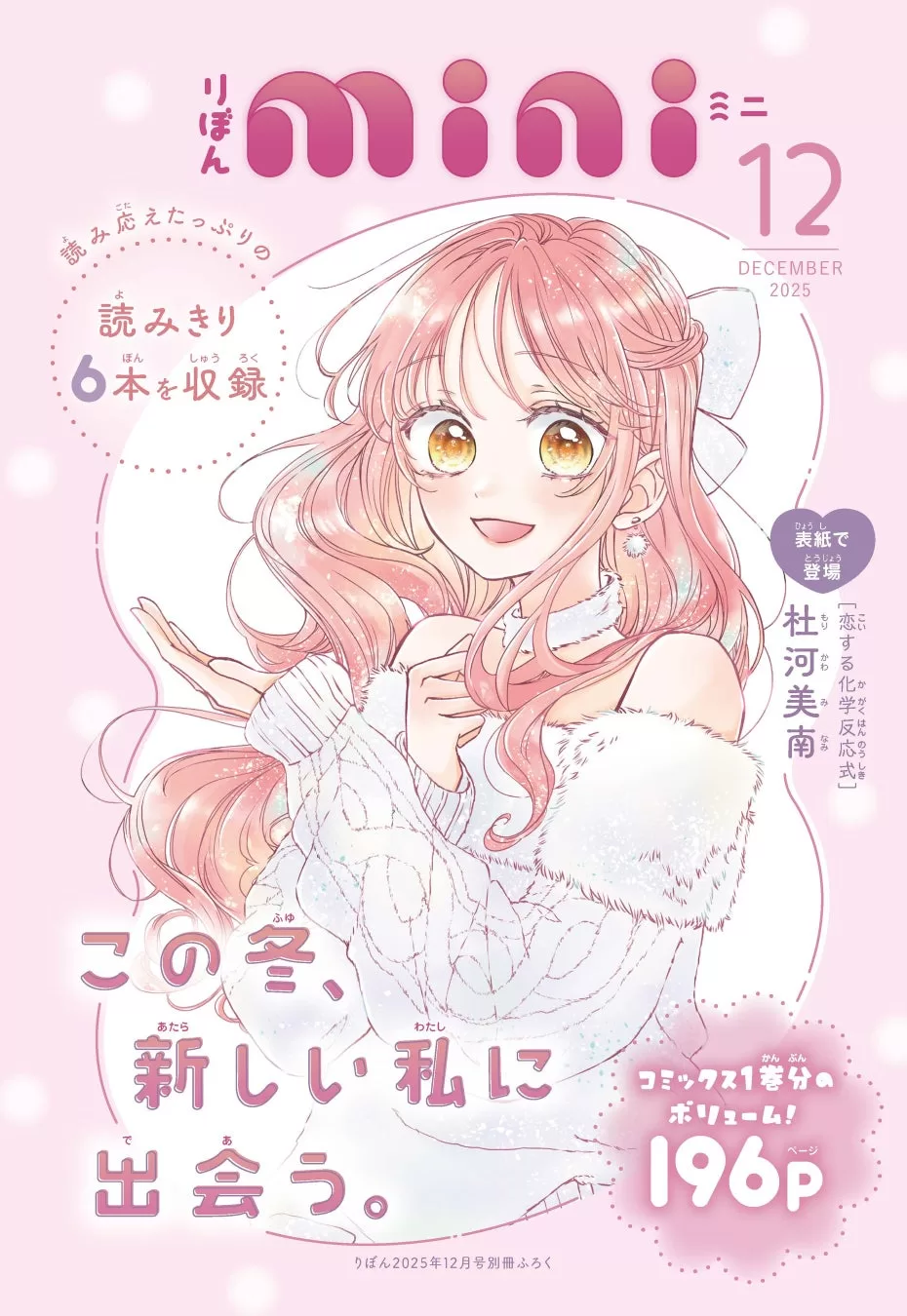 「この冬、新しい私に出会う。」をテーマにした別冊付録「りぼんmini」には、期待の新人作家による読みきり6本を収録。フレッシュな感性と個性が光る作品が勢ぞろいしています。掲載作品は、杜河美南・著『恋する化学反応式』、糸あみの・著『アオハルパンチ!』、いわい和奈・著『ウルトラすーぱーレア』、小川とり・著『あたしのカラフル』、金沢ころも・著『ひみつのシュガー~あなたに捧ぐ愛の歌~』、春吹雪・著『ミッドナイト=ハイ』。新たな才能が描く“冬のときめき”を詰め込んだ特別なミニ別冊です。