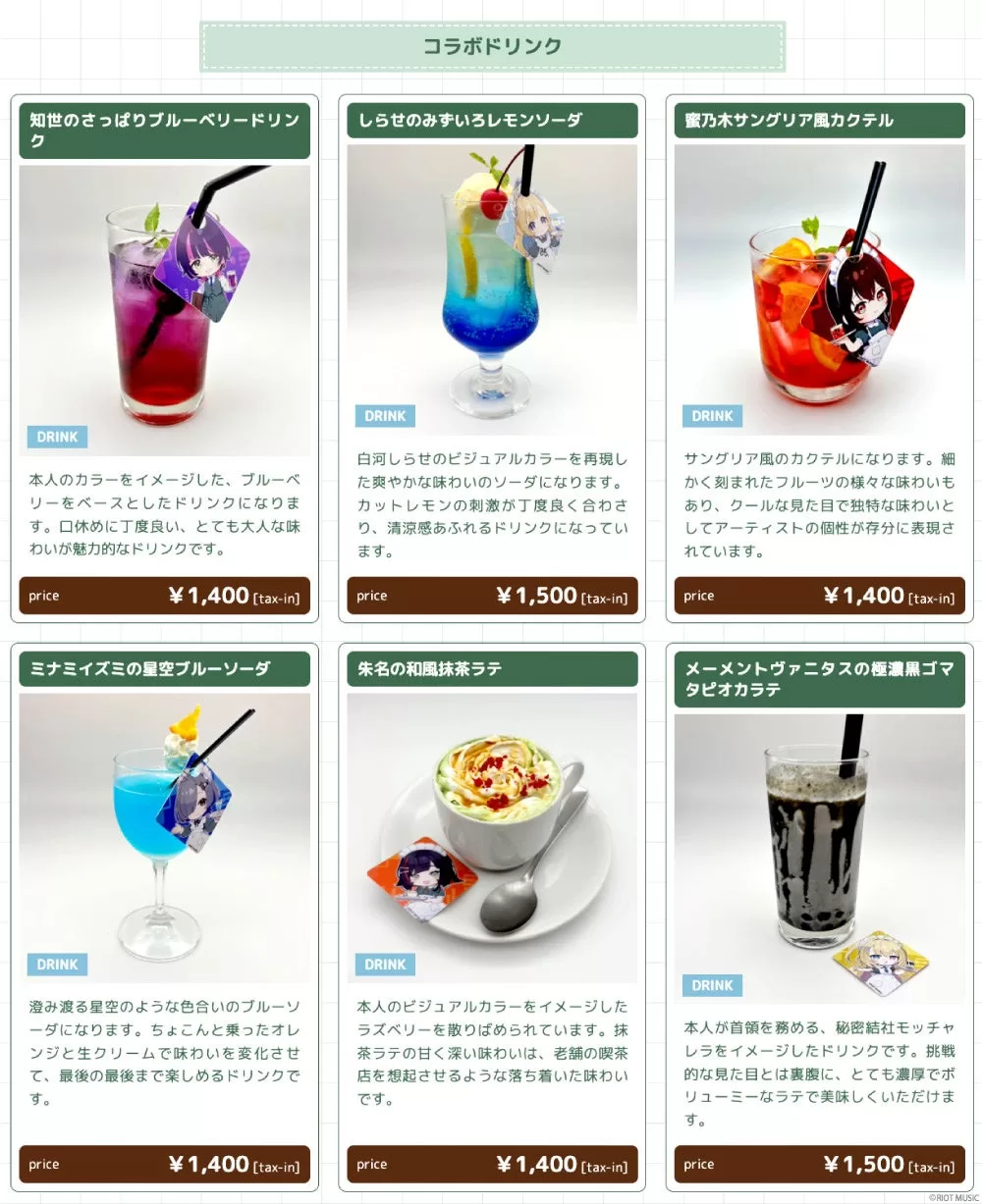 コラボメニューとして各アーーティストをイメージしたドリンクやフードを提供。ドリンクは「知世のさっっぱりブルーーベリードリンク」「しらせのみずいろレモンソーーダ」など6種類、フードは「依織のクレイジーおつまみセット」「美緒奈のトレーニングヘルシーバーガー」など5種類が用意されている。メニュー注文特典としてノベルティコースター(全10種ランダム)がプレゼントされる。