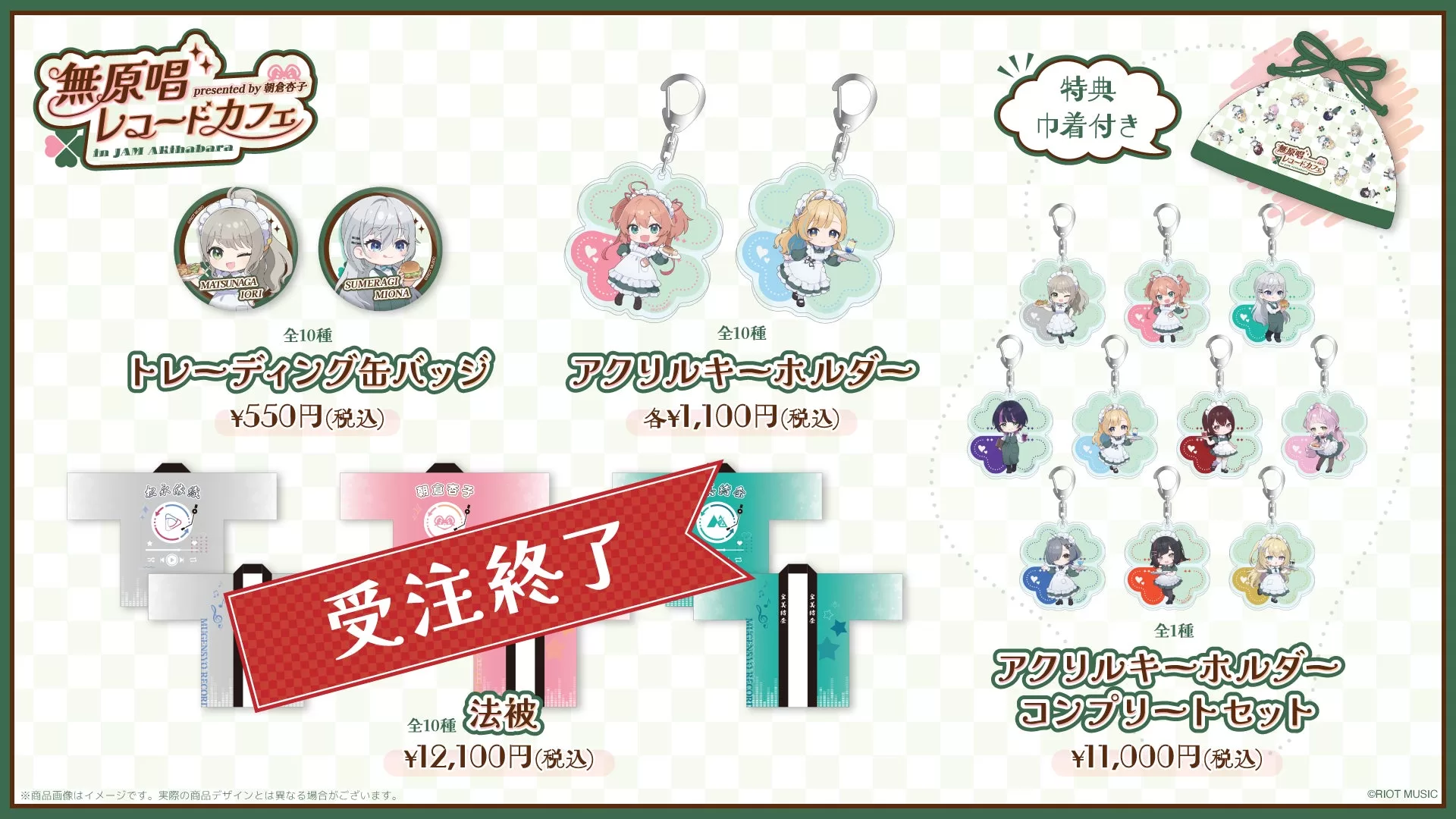 会場ではトレーーディング缶バッジやアクリルキーーホルダーなどの記念グッズも販売。コラボ期間終了後にはRIOT MUSIC OFFICIAL STOREで数量限定商品およびEC限定商品の販売が予定されている。詳細は無原唱レコード公式Xで後日発表される。