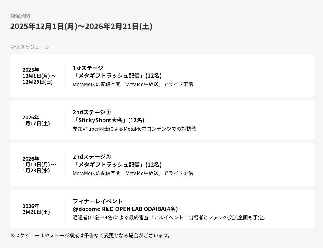 イベントスケジュールは、2025年12月1日から28日までの「メタギフトラッシュ配信」、2026年1月17日の「StickyShoot大会」、同年1月19日から28日までの「メタギフトラッシュ配信」を経て、2026年2月21日に東京・お台場のdocomo R&D OPEN LAB ODAIBAでフィナーレイベントが行われる予定だ。