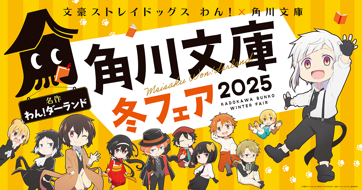 角川文庫は2025年12月1日から2026年1月31日まで「角川文庫冬フェア2025 名作 わん! ダーランド」を開催する。アニメ「文豪ストレイドッグス わん!」のキャラクターがフェアを盛り上げ、古今の名作を紹介する。