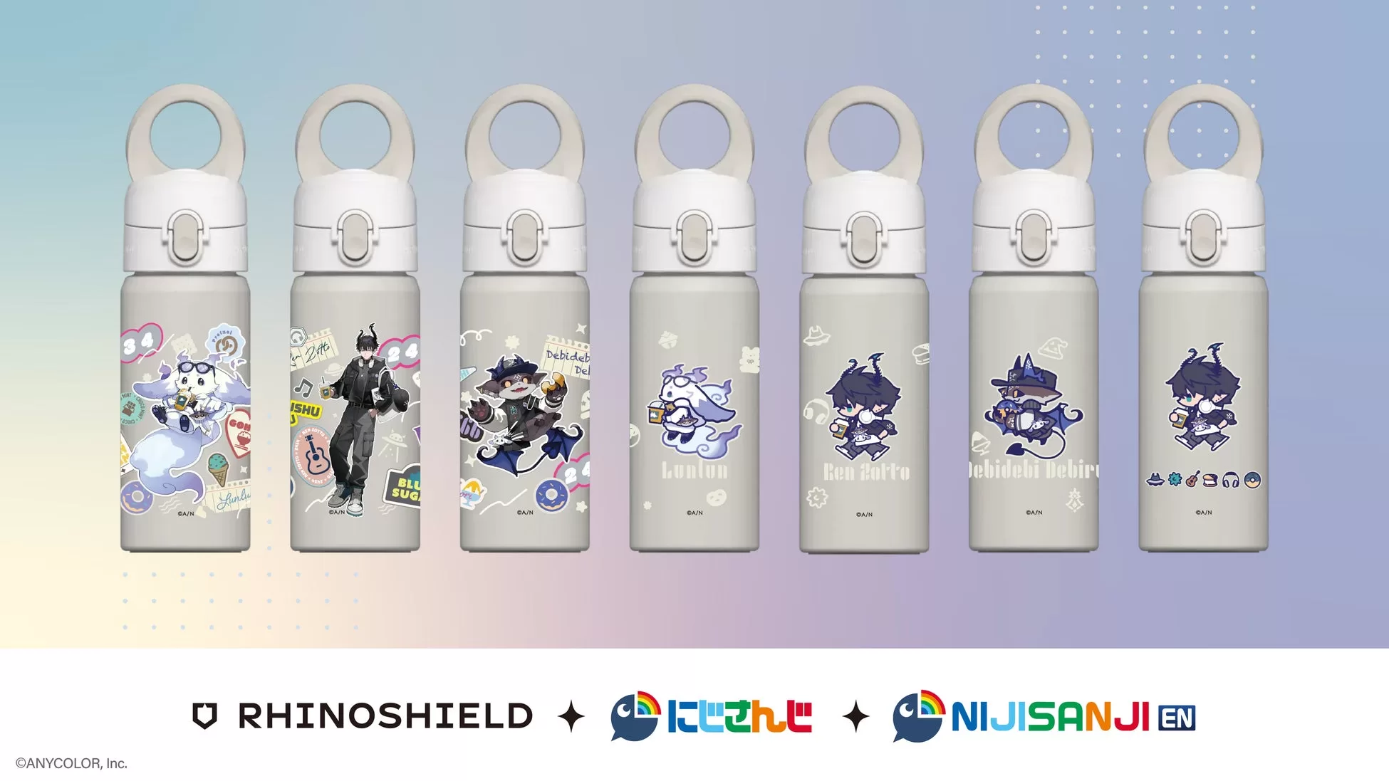 「RHINOSHIELD」と、「にじさんじ」の「ルンルン」「でびでび・でびる」、そして「NIJISANJI EN」の「Ren Zotto(レン ゾット)」によるコラボレーション商品を、期間限定で受注販売いたします。限定デザインのスマートフォンケースやAquaStandマグネットボトルなどが登場します。