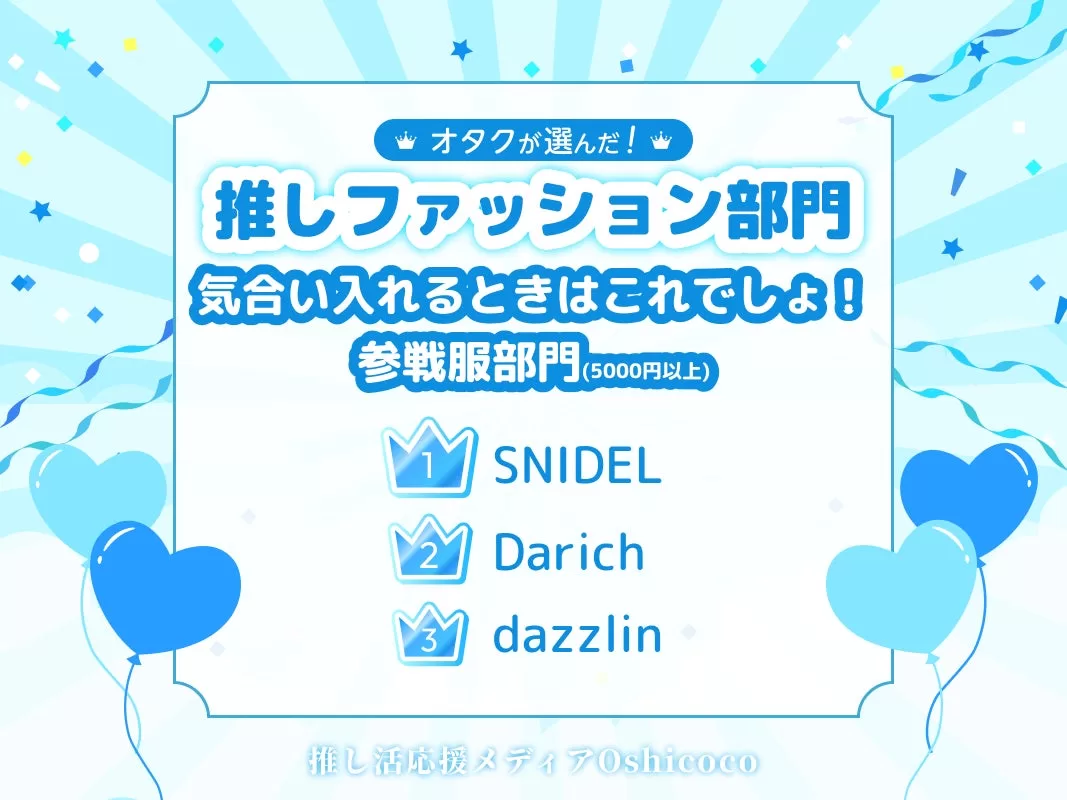 気合い入れるときはこれでしょ!参戦服部門(5000円以上) では、1位「SNIDEL」2位「Darich」3位「dazzlin」が入賞しました。普段はプチプラのお洋服を着ていても、イベントやライブの時には、せっかくだから気合を入れて推しに可愛い姿を見せたい・・・!!そんな特別な機会にぴったりな、背伸びをして買いたくなるようなブランドが人気を集めました。