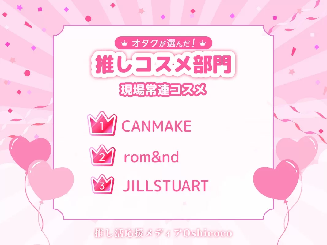 現場常連コスメ部門 では、1位に「CANMAKE」2位に「rom&nd」3位に「JILLSTUART」がランクインしました。プチプラだけど、安定に使いやすくて、かわいい! そんなブランドが人気な模様です。