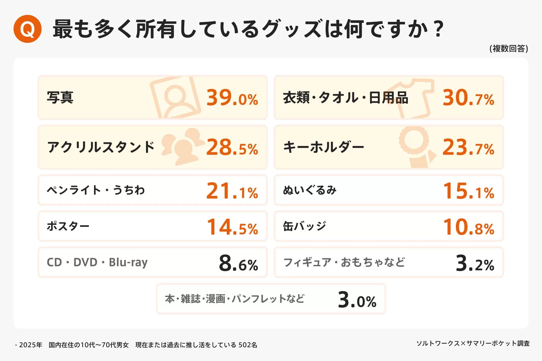 所有グッズの種類では「写真」(39.0%)が最多。次いで「衣類・タオル・日用品」(30.7%)といった実用的なグッズや、「アクリルスタンド」(28.5%)など収集しやすい小型グッズが人気を集めています。