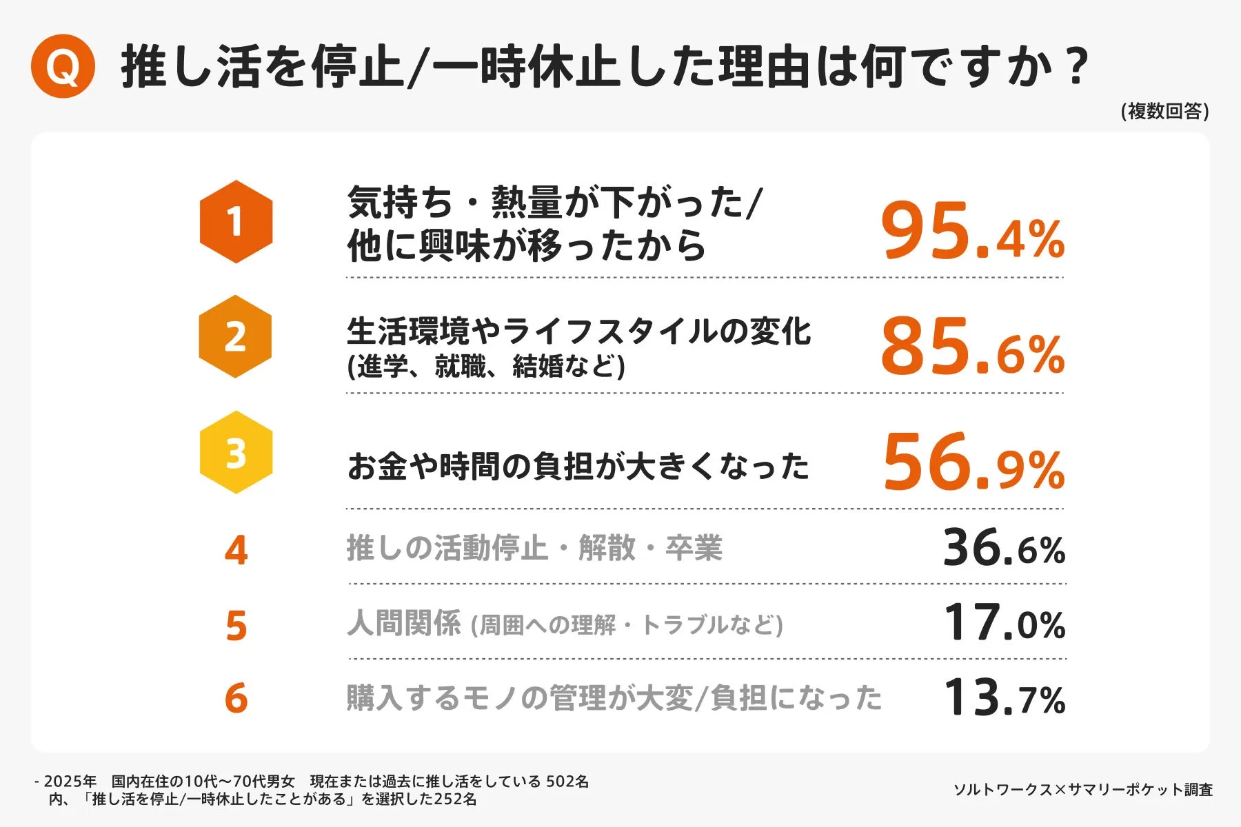 このほか、「推しやコンテンツの活動休止や解散、卒業」など、応援していた対象自体の状況が変わったことでやむを得ず離脱したという人も36.6%を占めています。加えて、「人間関係のトラブル」(17.0%)や「グッズの管理が負担」(13.7%)といった点も理由として挙げられています。