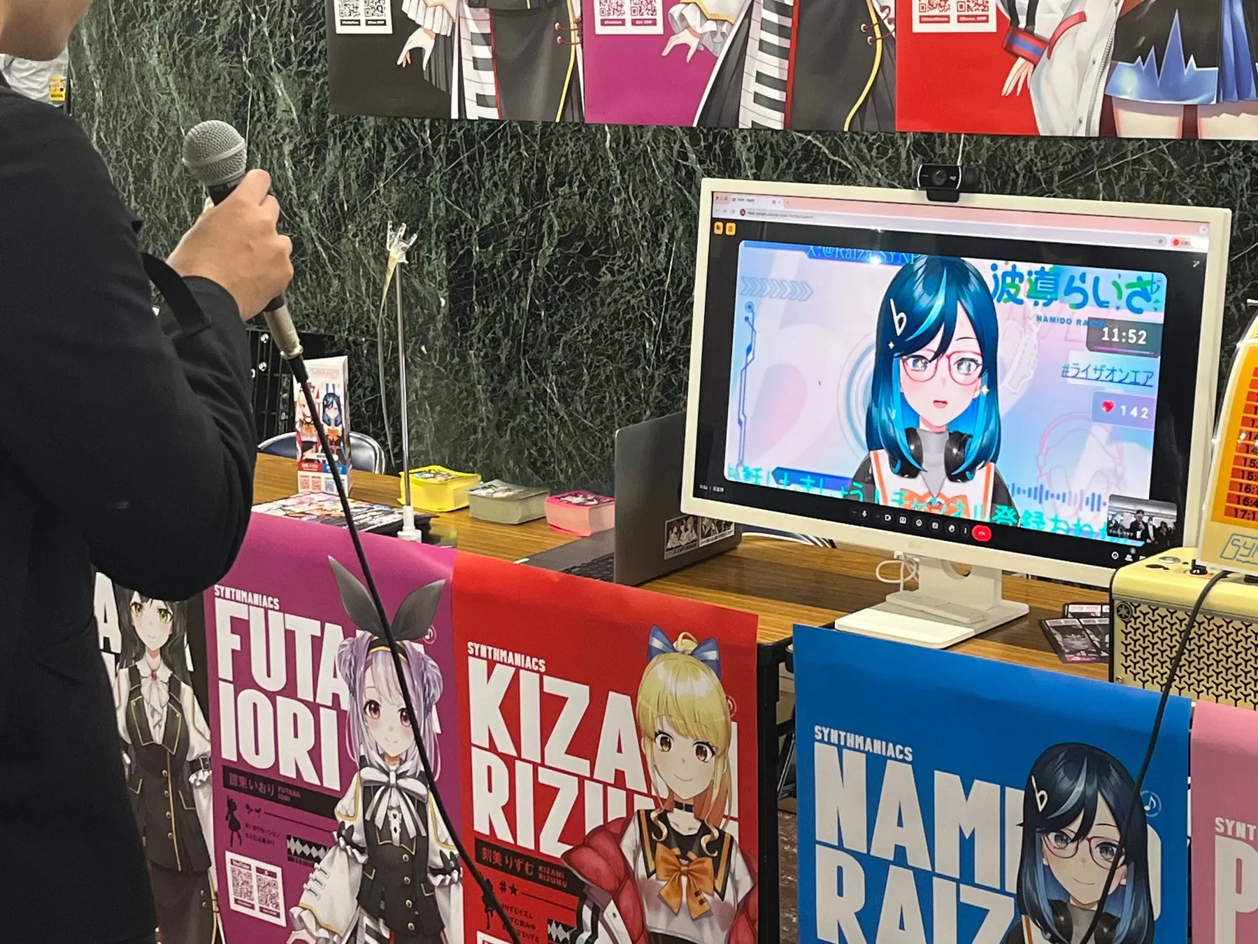 シンセマニアクスブースでは、描き下ろしイラストを使用した限定ステッカーを配布したほか、ブースに設置されたモニターにVTuberメンバーがバーチャル出演して来場者との交流を行った。