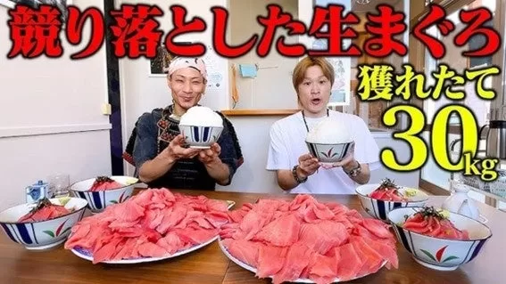 生まぐろ水揚げ日本一の「和歌山県那智勝浦町」にて、那智勝浦町観光企画課、及び勝浦魚商協同組合の協力を得て、当日朝水揚げされた「30kgの生まぐろ」を、その場で勝浦魚商協同組合の木下理事長に捌いていただき、「30kgの生まぐろ」を1本丸々完食!