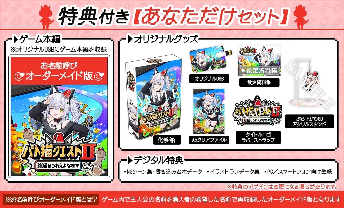 「あなただけセット」は、購入者の名前を猫元パトが特別に収録し呼んでくれるオーダーメイド版のゲーム本編が収録された先着50名限定の商品で、価格は29,700円(税込)。オーダーメイド版ゲーム本編に加え、描き下ろしアクリルパネルなどのオリジナルグッズも同梱される。