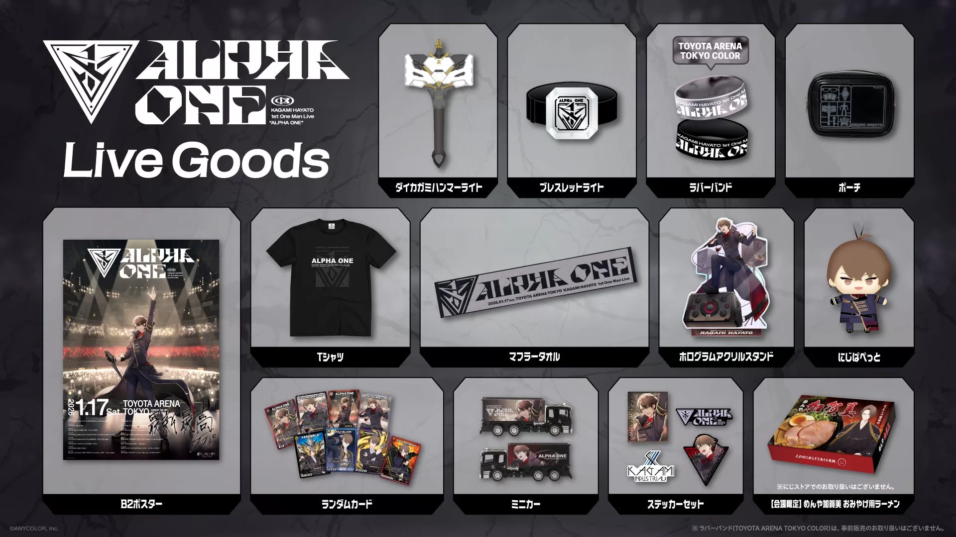 2026年1月17日(土)にTOYOTA ARENA TOKYOにて開催される「加賀美ハヤト 1st One Man Live “ALPHA ONE”」(https://www.nijisanji.jp/events/kagami_alphaone/)のライブグッズが登場!