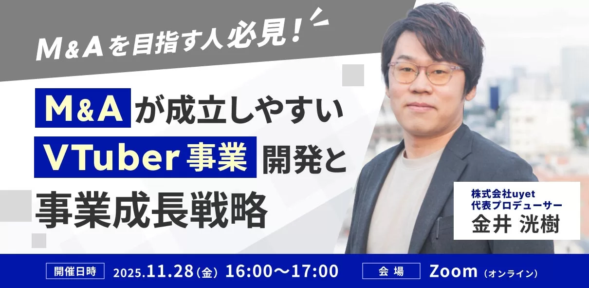 株式会社uyetは、2025年11月28日16時より、VTuber事業を行う企業向けのオンラインウェビナー「VTuber事業M&Aを目指す人必見!M&Aが成立しやすいVTuber事業開発と事業成長戦略」を開催する。参加費は無料で、Zoomを使用して行われる予定だ。