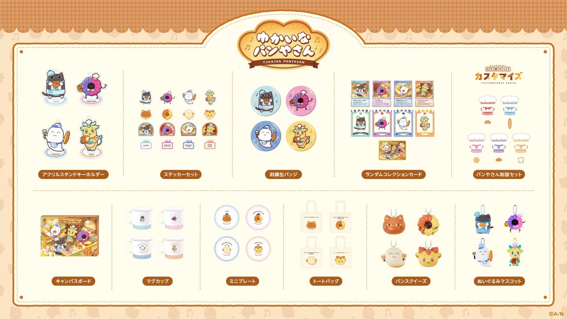 グッズラインナップは、ランダムコレクションカード、刺繍缶バッジ、アクリルスタンドキーホルダー、ステッカーセット、キャンバスボード、マグカップ、ミニプレート、トートバッグ、ぬいぐるみマスコット、パンスクイーズの10種類。