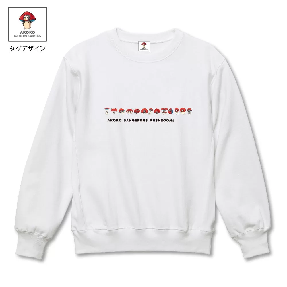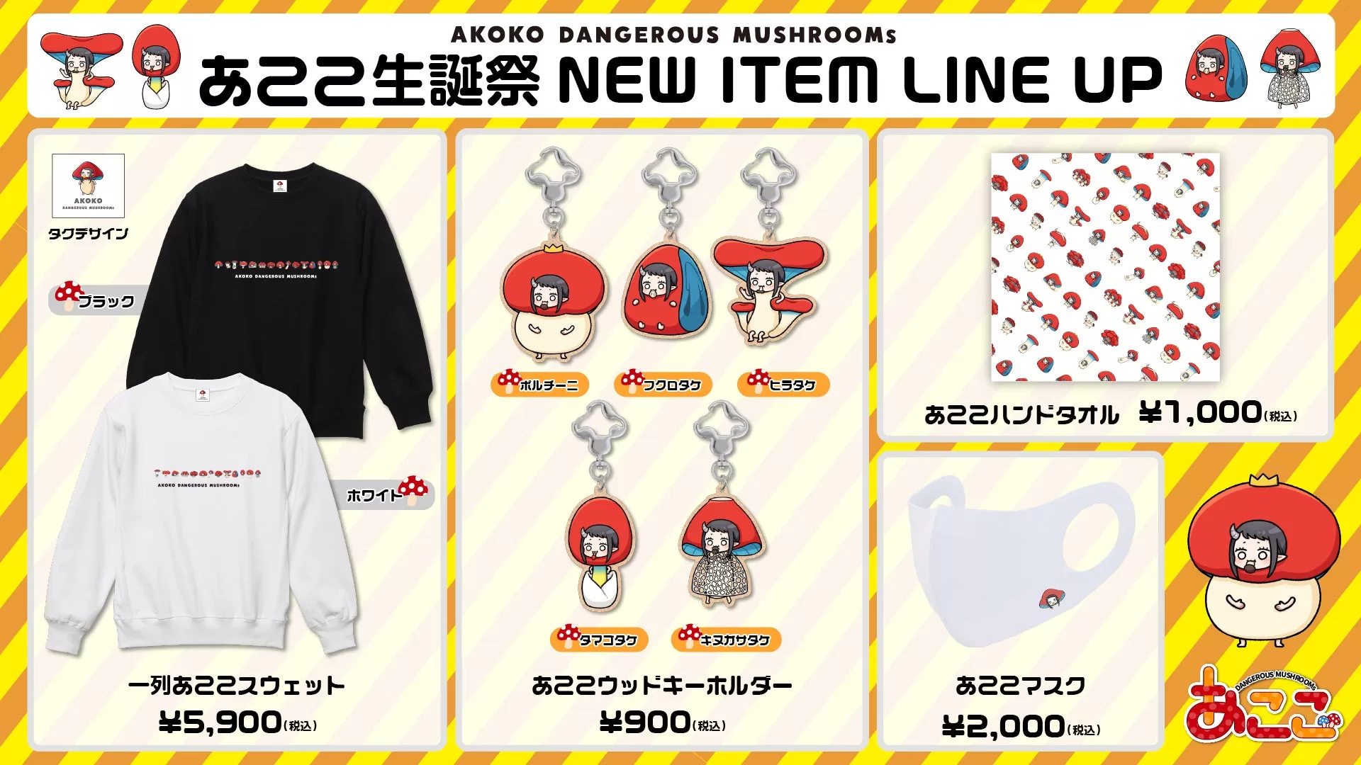 今回のラインナップはきのこをテーマにしたあここワールドを表現したアイテムが揃っている。フロントにあここたちが一列に並ぶデザインの「スウェット(黒/白)」をはじめ、きのこ型ナスカンが特徴の「ウッドキーホルダー」シリーズ、「ハンドタオル」「マスク」など日常で使用できる商品がラインアップされた。