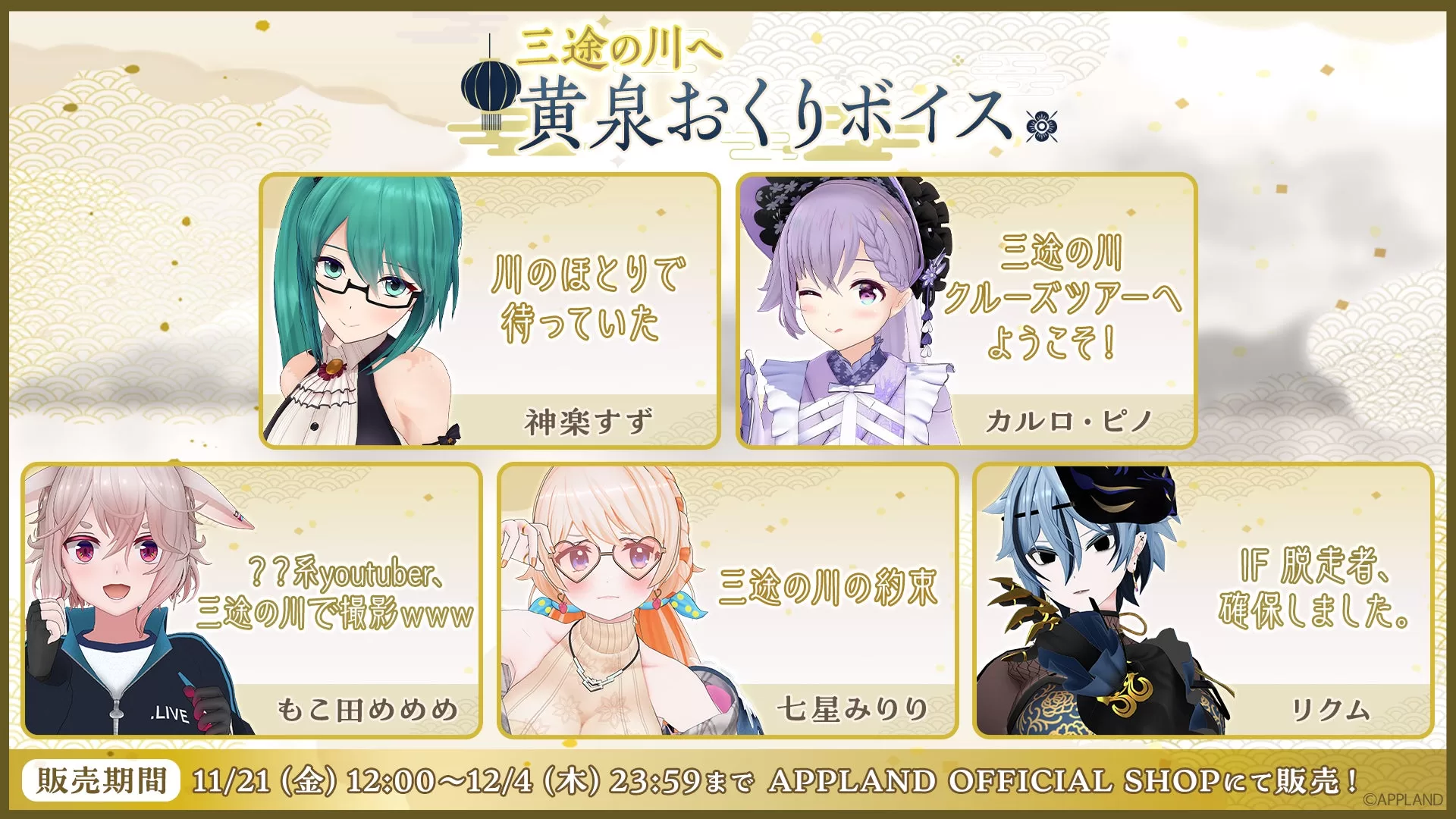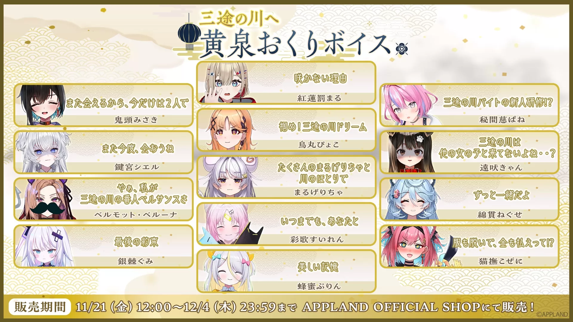 販売期間は2025年12月4日(木)23時59分までで、APPLAND OFFICIAL SHOP(https://4693.live/ )にて行われる。テーマは『三途の川初心者のあなたをまったり案内♪この川、悲しい別れだけでは無いのかも…?』で、各VTuberが考案した三途の川を舞台にしたシシチュエーションが楽しめる内容となっている。