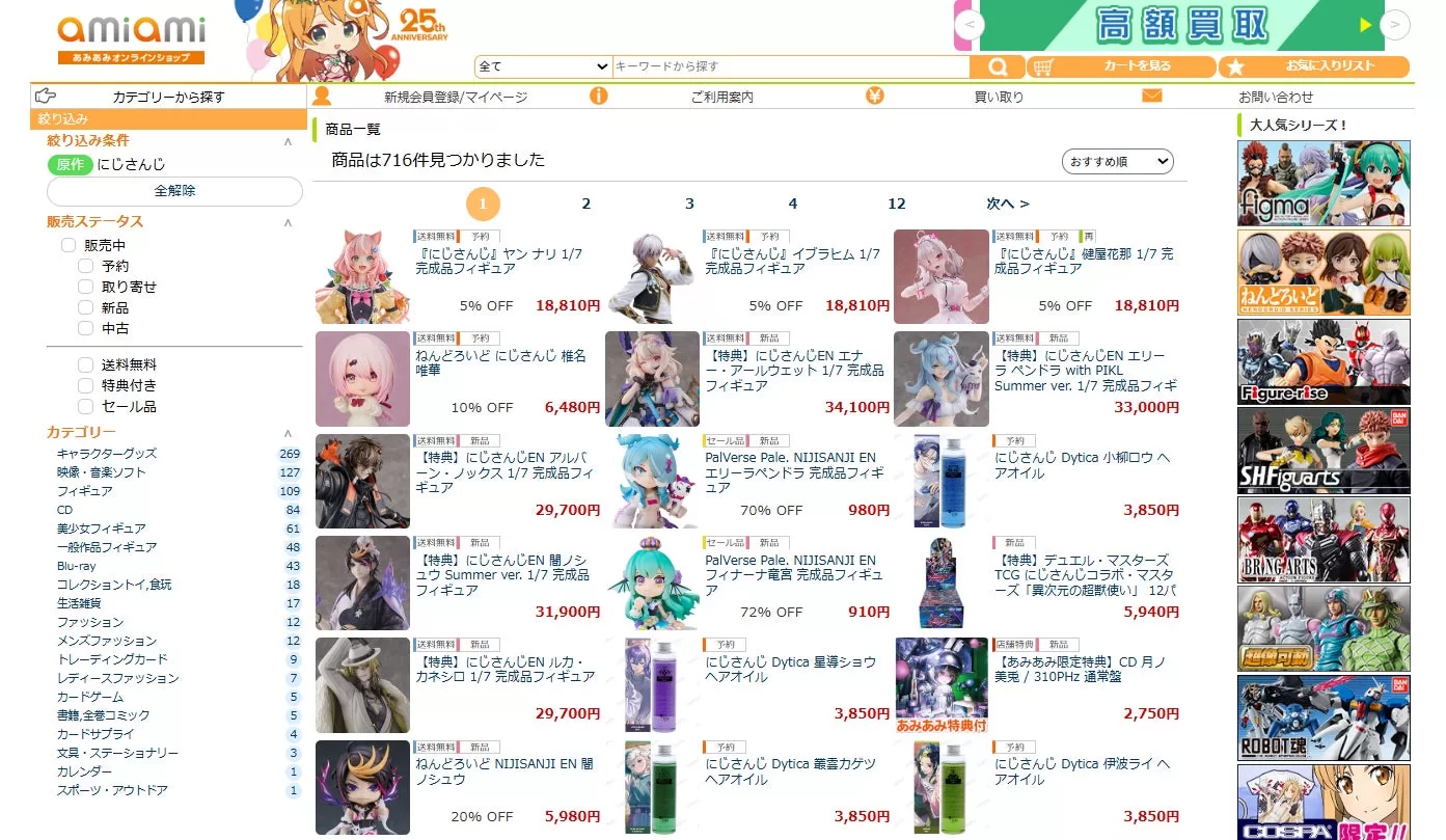 詳細はあみあみオンラインショップ、またはあみあみ実店舗サイトで確認可能。にじさんじ関連製品も多数取り扱われています。