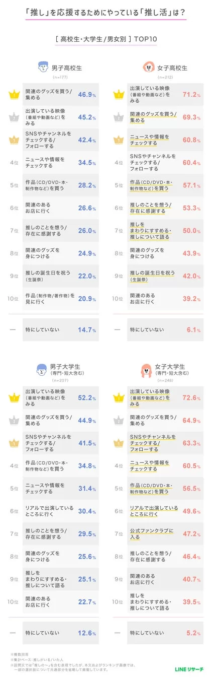 大学生の傾向をみると、「リアルで出演しているところに行く」が男女ともに6位にランクイン。また、女子大学生では唯一「公式ファンクラブに入る」がTOP10入り、4割台後半の高い割合でした。