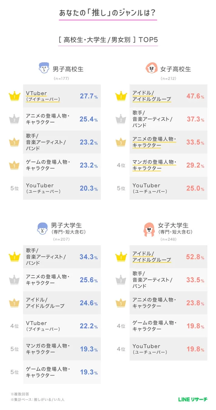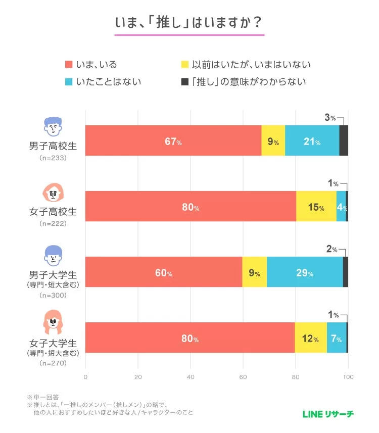 女子高校生・女子大学生の約8割が“いま、推しがいる”!推しのジャンル1位はアイドル | LINEリサーチ調査レポート|リサーチノート powered by LINE