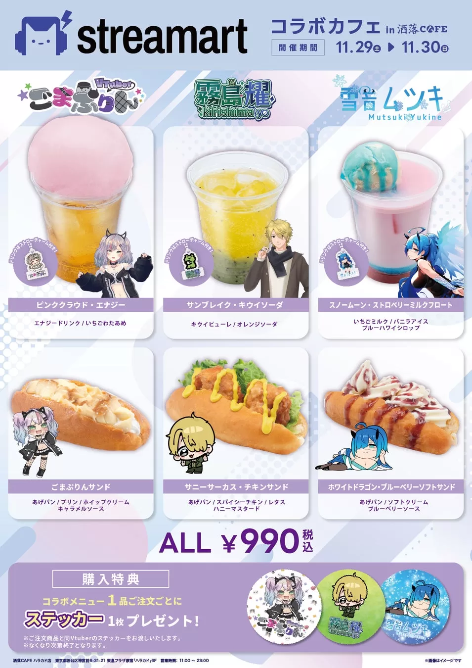 9月に開催された「streamart」(旧ETERNAL MEDAL)を使用した投票企画にて1位を獲得したVtuber「ごまぷりん」「霧島耀」「雪音ムツキ」の3名をイメージしたオリジナルドリンクやフードを提供。