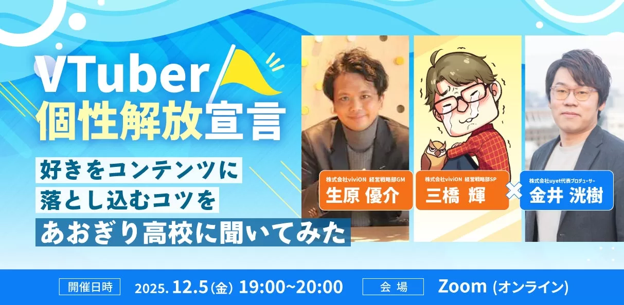 VTuber、IPコンテンツの総合商社として知られる株式会社uyet(本社:東京都渋谷区、代表取締役:梶田大樹)は、株式会社viviONと共同で、2025年12月5日(金)19:00より、VTuber、Vライバー向けウェビナー「VTuber個性解放宣言 〜好きをコンテンツに落とし込む方法をあおぎり高校運営に聞いてみた〜」を開催すると発表した。