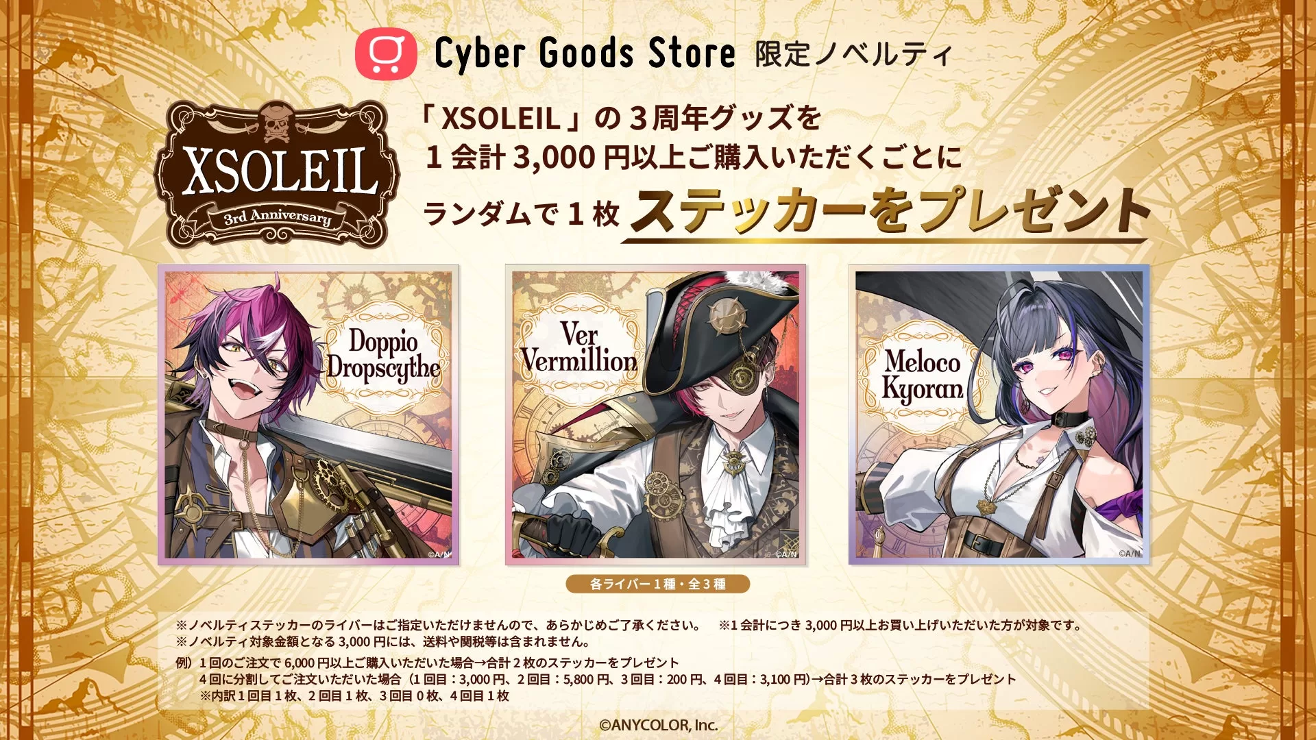 Cyber Goods Storeにて「XSOLEIL(エクソレイ)」3周年記念グッズを1会計3,000円以上ご購入いただくごとに、ランダムで1枚ステッカーをプレゼントいたします。(全3種)