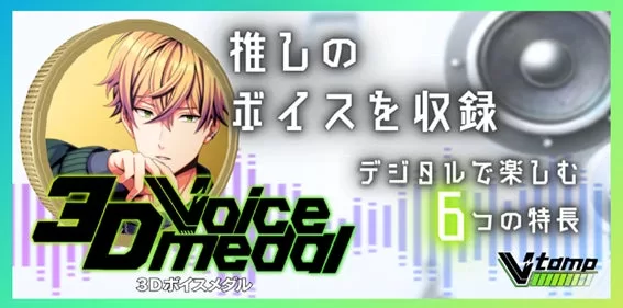 3Dボイスメダルは、VTuberのボイスデータが内蔵されたメダル型の3Dモデルデータで、デザイン性の高いメダルに特別なボイスを収録。V-tamp内やglb形式対応のメタバース空間に飾ることが可能。
