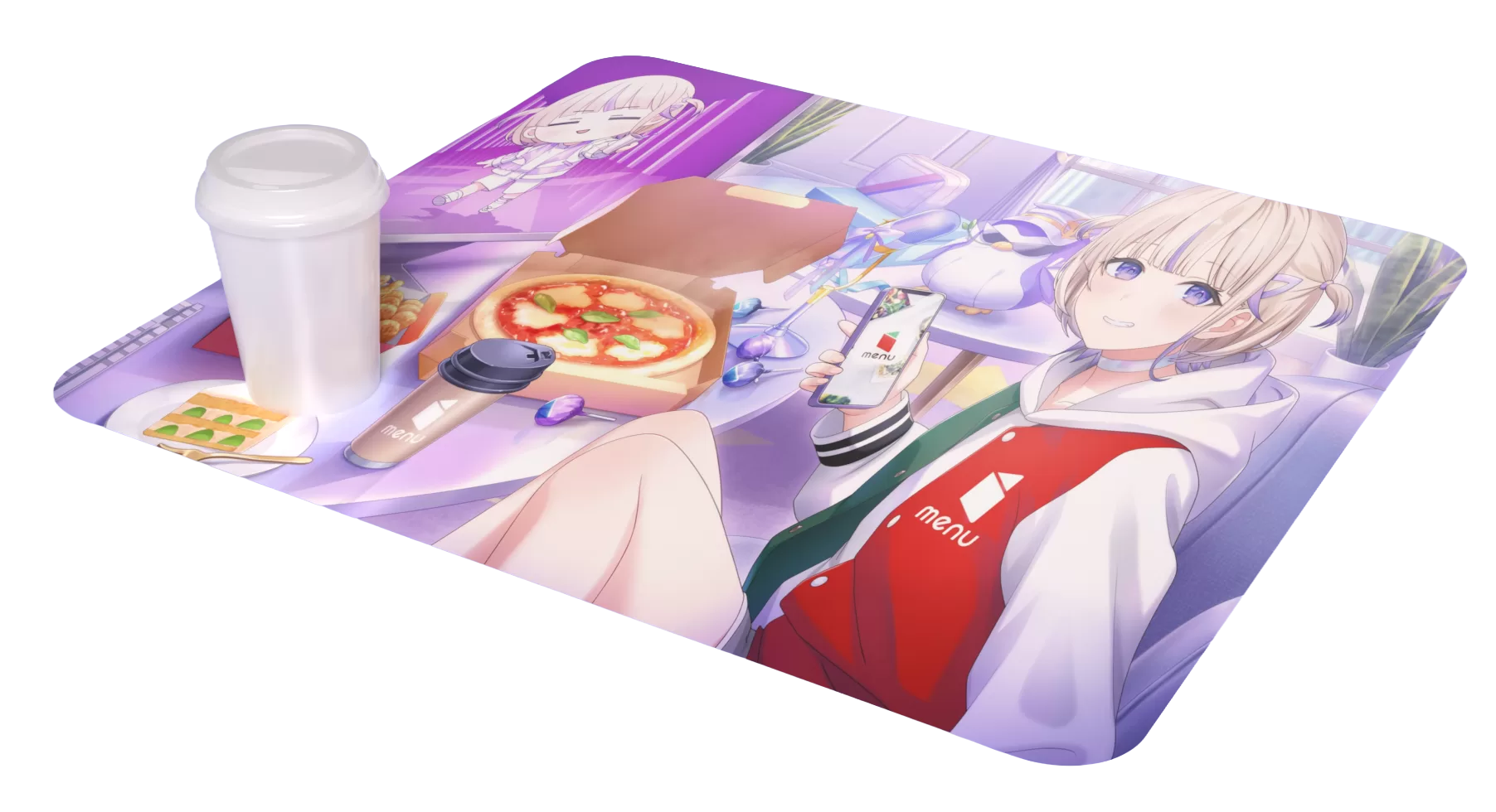 「“おかわり”ご注文キャンペーン」は、3つの期間に分けて実施します。期間中にmenuで1,500円以上ご注文いただいた方の中から、第1弾は抽選で500名様に「ポストカード」、第2弾は抽選で最大50名様に「ランチョンマット」、第3弾は抽選で30名様に「アクリルパネル」をプレゼントします。いずれの景品も、本企画のために描き下ろした限定イラストを使用しています。