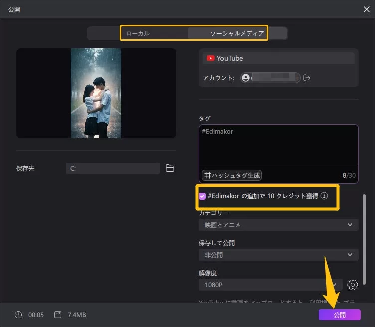 SNS投稿キャンペーンでは、YouTube公開 & #Edimakor を付けて投稿いただくと、毎日10 AIクレジットを付与します。