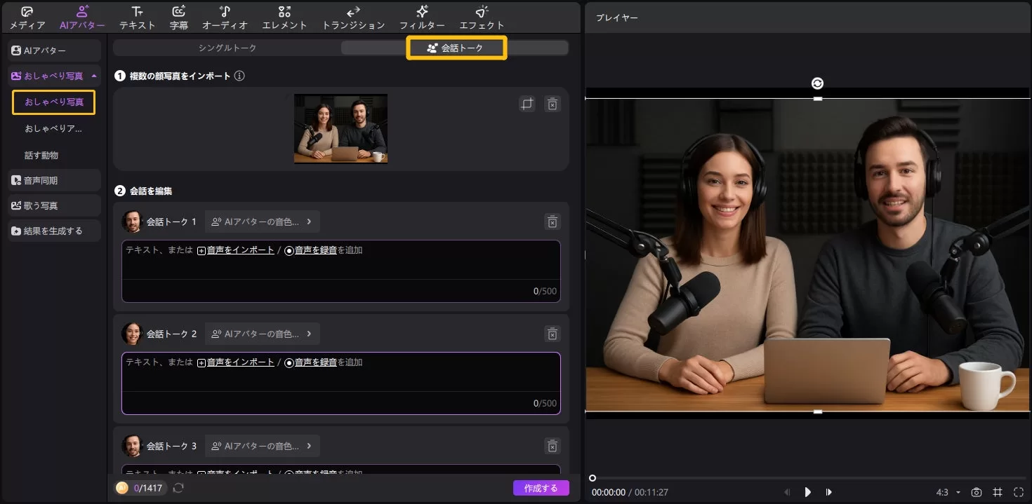 静止画から人物が話す映像を生成できる「AIおしゃべり写真」に、新たに「会話トークモード(複数キャラ会話)」が追加されました。