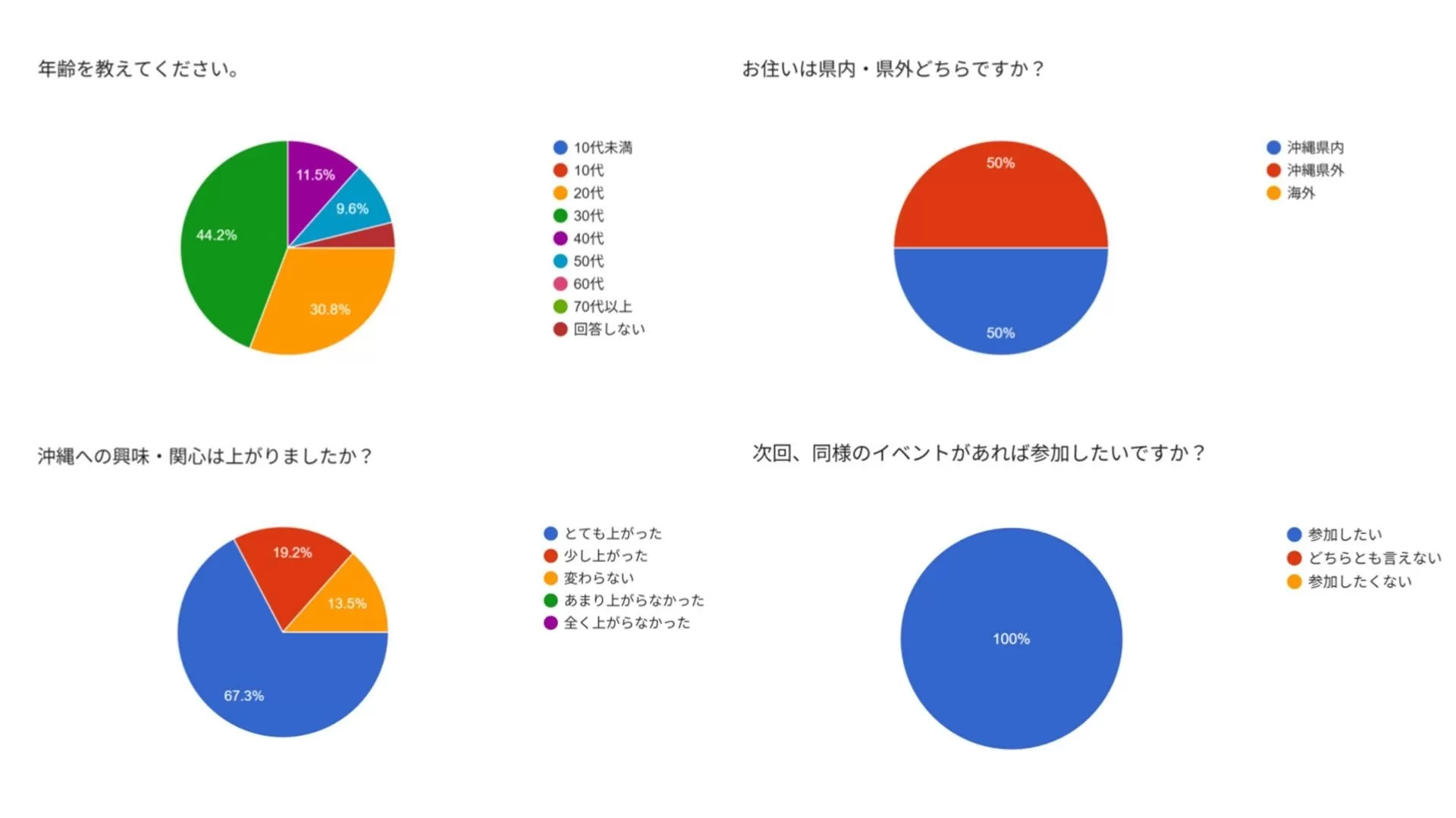 とくに “次回も参加したい” が100% という結果は、「イベントそのものが沖縄に行く理由になった」 と言える非常に重要な指標です。